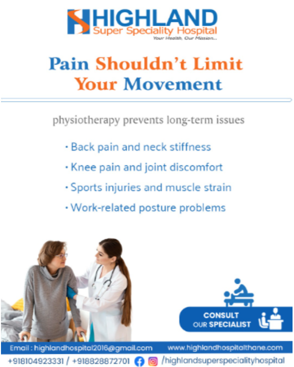 Getting back to normal life after pain or injury takes time and the right support. Highland Hospital Thane provides dedicated physiotherapy care to help you rebuild strength and move forward with greater ease.